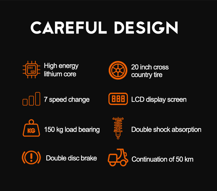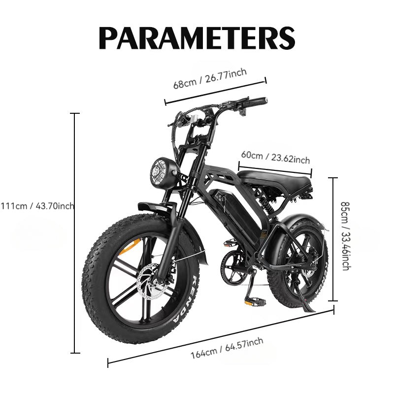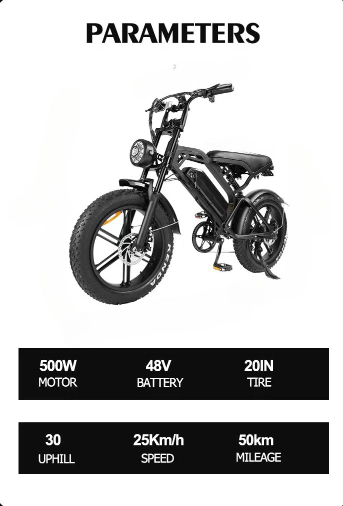 Wheel Size: 20 inch Cast Wheel Body Material: Iron Folding: No Maximum Speed: 45 km/h Battery: 48V15AH Charger: 110V-240V 54.6V 2A Electric Range: 40-55 km Charging Time: About 8 hours Instrument: Central Color Screen Controller: 48V 9-tube Current Limiting 22A Foc Silent Motor: 500W Gearbox: Shimano 7-speed Tires: 20*4.0 All Black Tires Suspension: Dual Front Fork Shocks Rear Central Shock Brakes: Disc Brakes