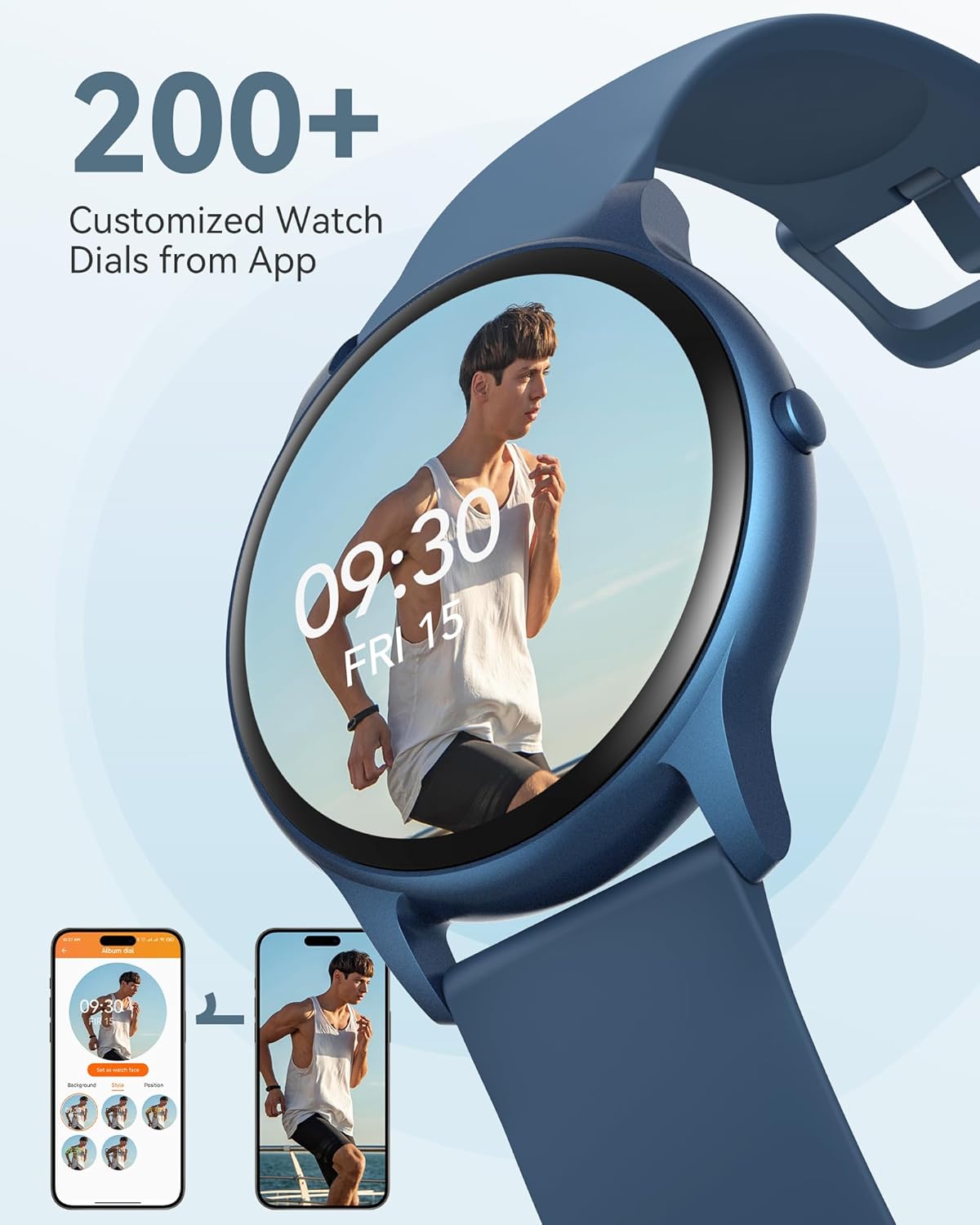 【200+ DIY DIALS & HIGH-RESOLUTION DISPLAY】The smart watch has built-in 4 dials and over 200 colorful watch faces in the app. You can also DIY watch faces by uploading your favorite photos, such as family, pets, nice pictures, etc to express your personality or match your daily outfit and mood! With a 360*360 high-resolution color screen, offers a clear, detailed view of your time, notifications, and fitness data. (NOTE: 1.3"/33mm is the display screen, and the whole watch face is 1.81"/46 mm).