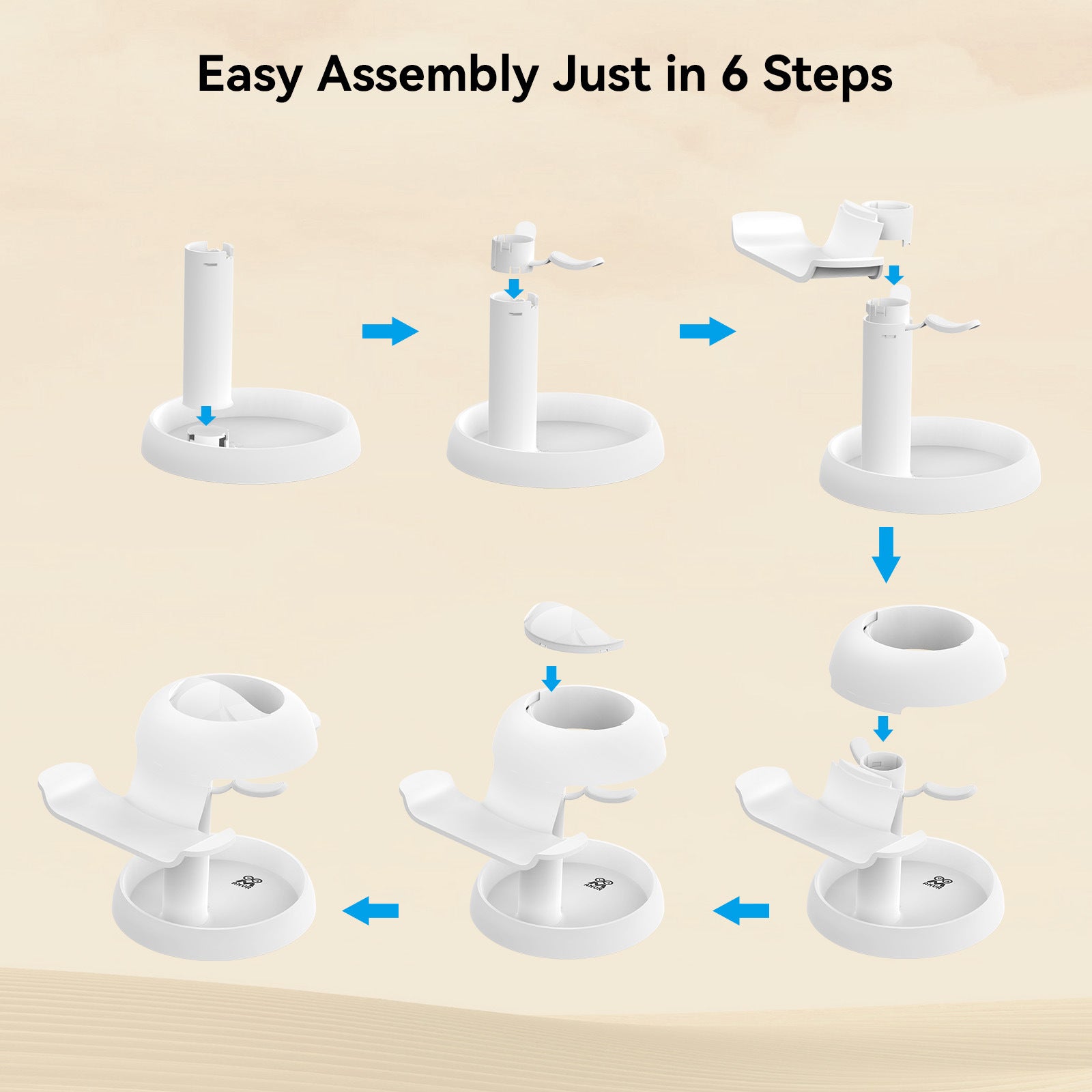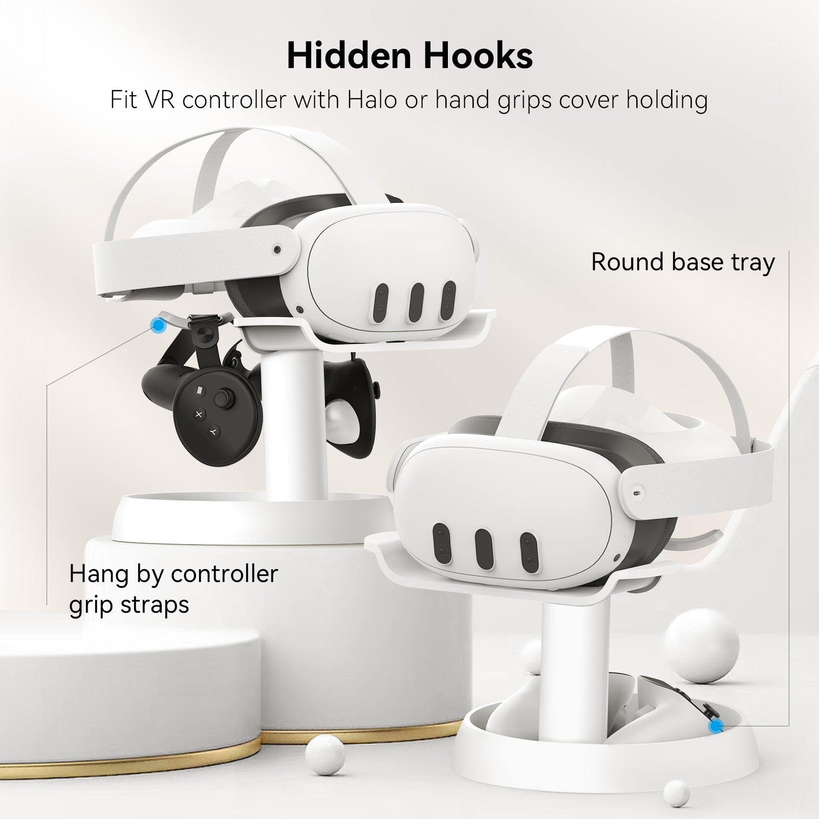 By storing your headset and controllers upright and off the surface, the stand significantly reduces dust accumulation on the lenses and sensors, which is crucial for maintaining optimal performance and visual clarity.