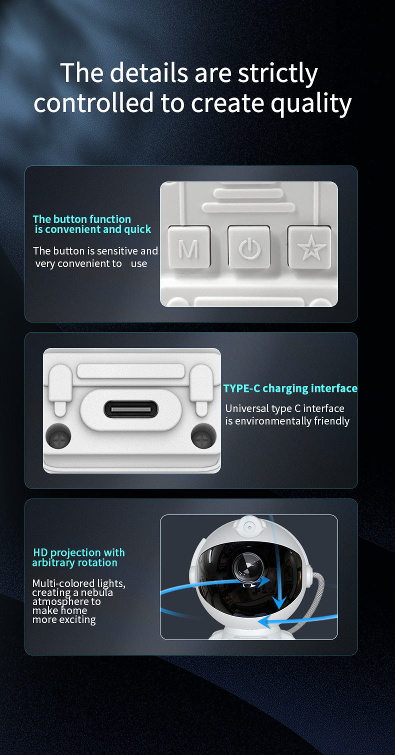 Transform any space into a stunning galaxy with the Astronaut Star Projector Night Light! Featuring LED starry sky projections, this ambient lamp casts a mesmerizing cosmos display across walls and ceilings, creating a soothing atmosphere. Perfect as a night light, decorative piece, or unique gift, the astronaut design adds a playful and modern touch to any room decor. Ideal for both kids and adults, this projector is great for bedrooms, parties, or relaxation spaces, bringing a universe of stars right to your home.