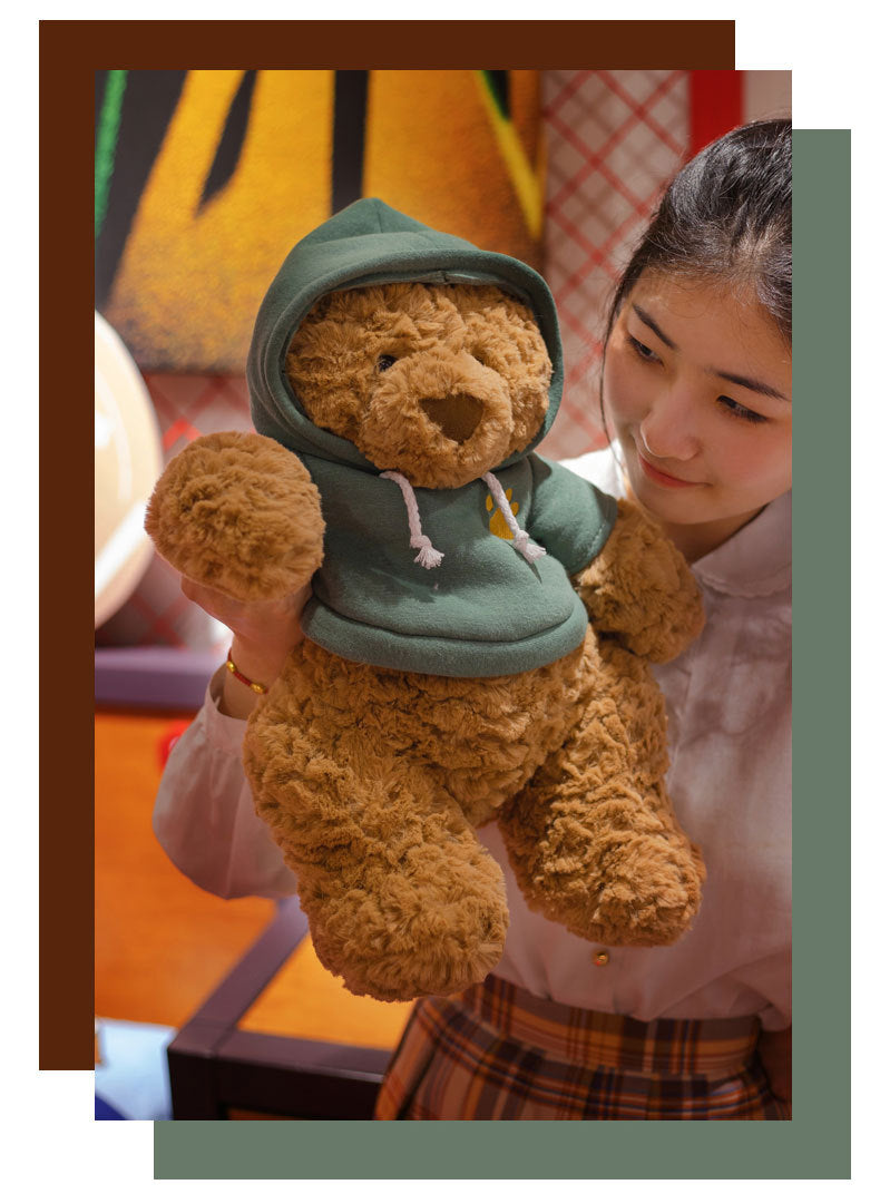 The plush toy comes in different sizes, including 28cm (0.25kg), 35cm (0.4kg), 40cm (0.6kg), and 47cm (0.7kg), and is filled with high-quality three-dimensional vacuum PP cotton.
