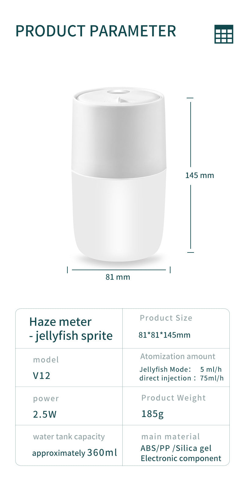 The PINVO V12 Jellyfish Elf humidifier has a built-in battery and USB mode with a rated power of 2.5. The humidifier does not have a timing function. Experience a refreshing and relaxing environment with the PINVO Creative Smoke Ring Humidifier - the perfect addition to your home or office space.