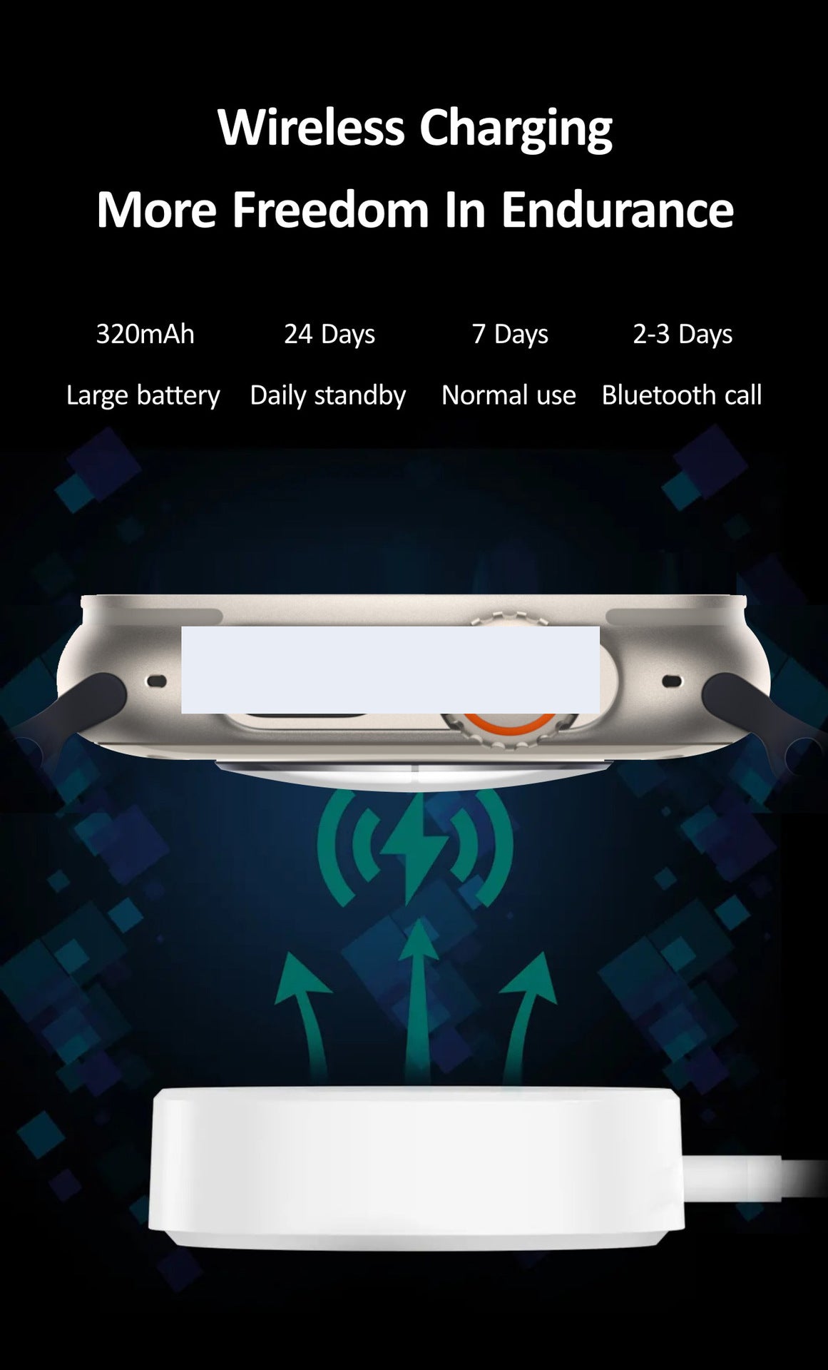 The HK8 Professional Edition Maximum Smart Watch comes with a wireless charging method and has a durable titanium alloy case. The wrist strap is made of environmentally friendly silicone, making it both comfortable and sustainable. This watch also has a long-lasting battery life, with a duration of up to 7-14 days.