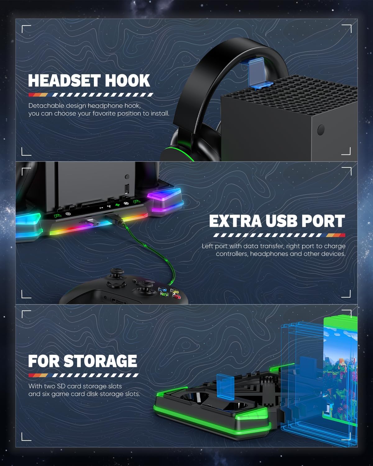Keep Gaming Setup Organized — Keep your gaming area tidy with this multifunctional accessory for Xbox Series X, with space for 6 game discs and 2 expansion card slots. It also includes a headset stand for your headset when is not in use. This charging station of xbox series x is designed to keep your gaming space organized and clutter-free. (Note: the USB ports at the front of the charge stand one supports data transmission and one for charging.)
