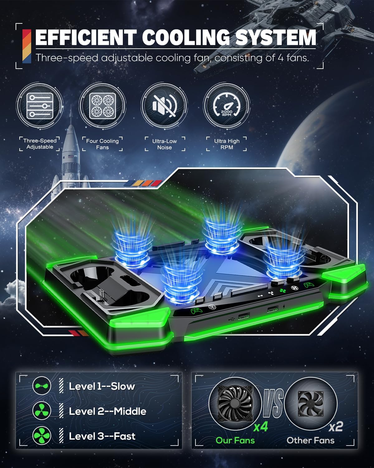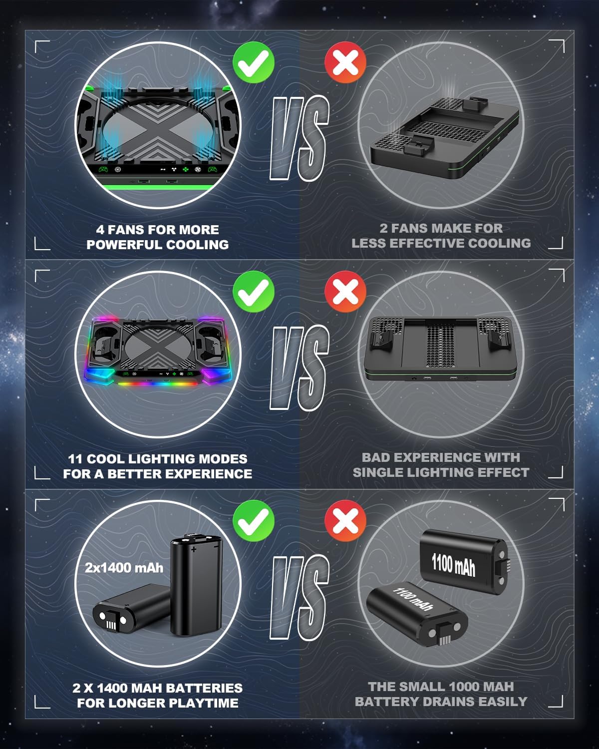 All in One Accessories for Xbox Series X— 4 high-performance cooling fans keep console at optimal temperatures. The dual charge stand comes with 2 rechargeable batteries, ensuring your controllers are always ready for action. With 11RGB light modes, you can personalize your gaming environment to suit your style. The accessory also offers a headset stand, 2expansion card slots, and space to neatly store up to 6 game discs, helping you keep gaming area organized.