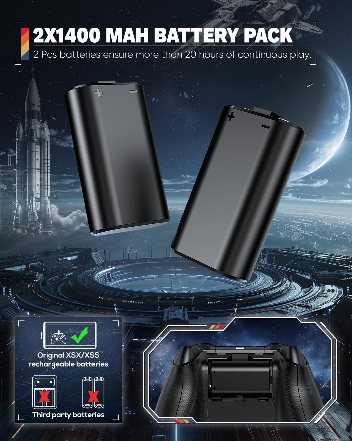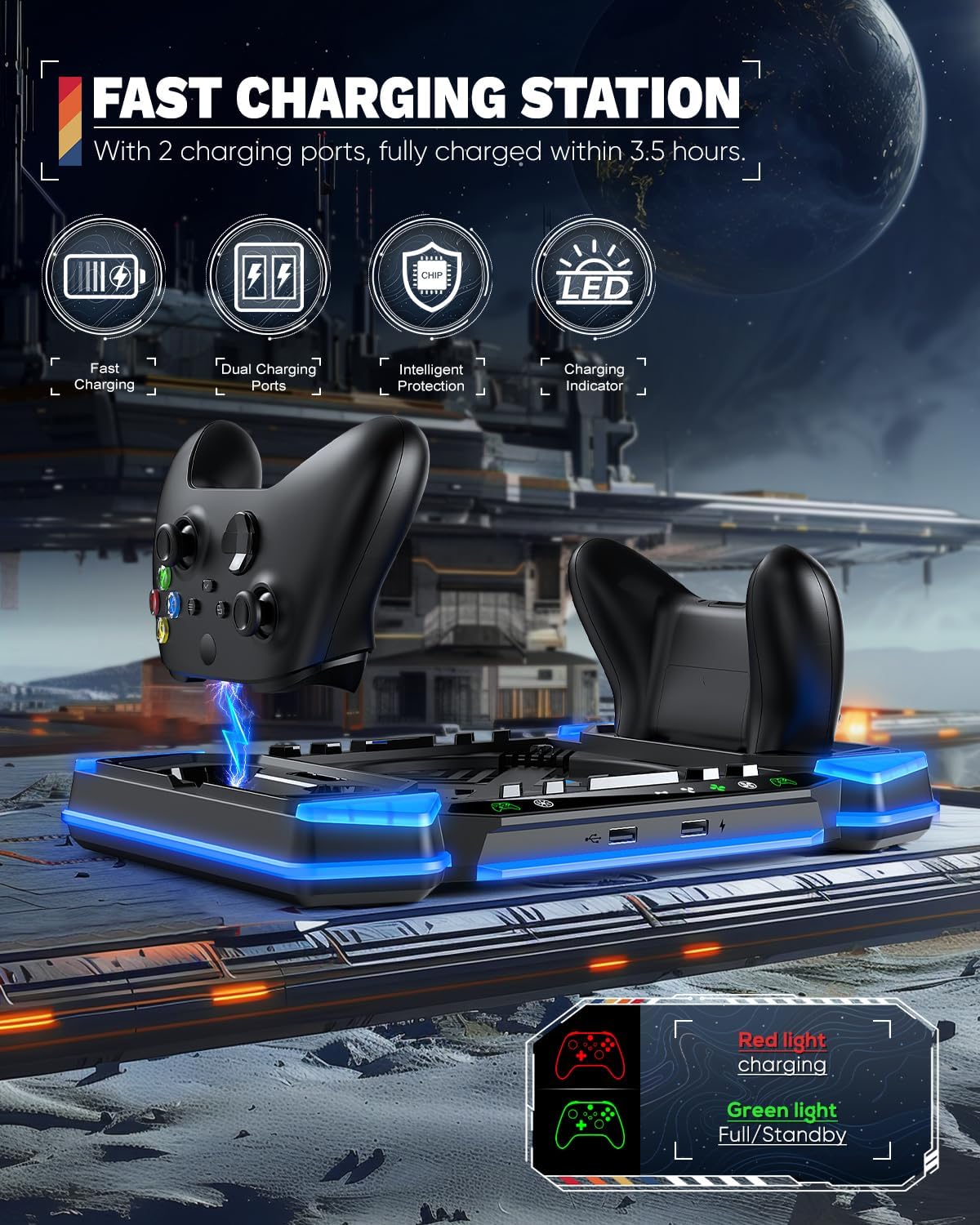 Dual Charging Dock for Controller — The charger station for Xbox Series X quipped with 2 x 1400mah batteries, it can fully charge 2 controllers for Xbox Series X at the same time within 3.5 hrs. During charging, a red indicator will show. When fully charged, the indicator is green. (Note: ONLY charge for Xbox Series X original battery and the battery we provide, not charge for third party battery.)