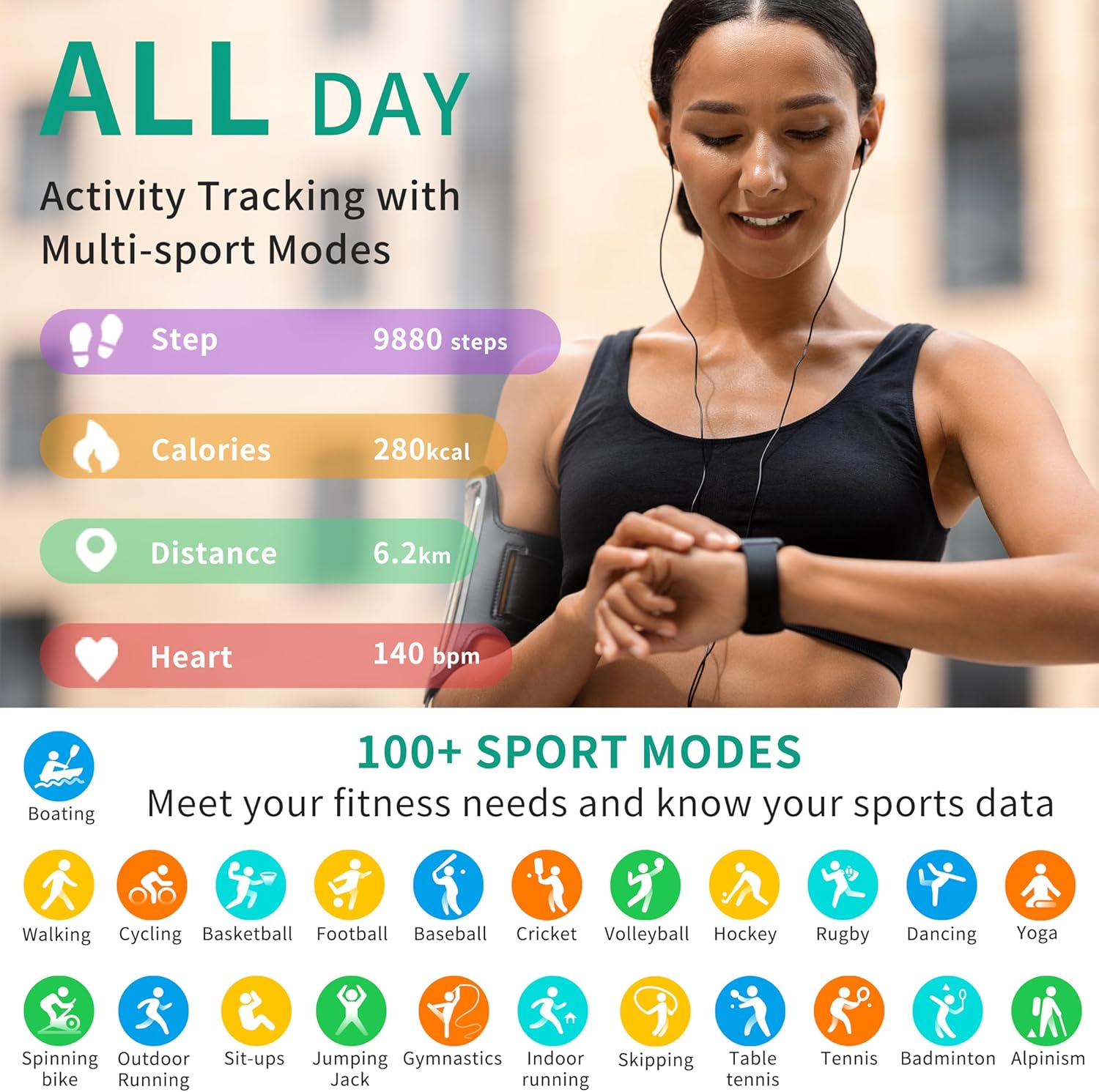 100+ Sports Modes: The fitness tracker can monitor various sports modes with built-in 100+ sports modes(outdoor running, cycling, skipping, badminton, table tennis, alpinism, tennis, walking, basketball, football, baseball, cricket, volleyball, hockey, rugby, dancing, yoga, spinning bike, sit-ups, indoor running, boating, gymnastics, jumping jack and more).