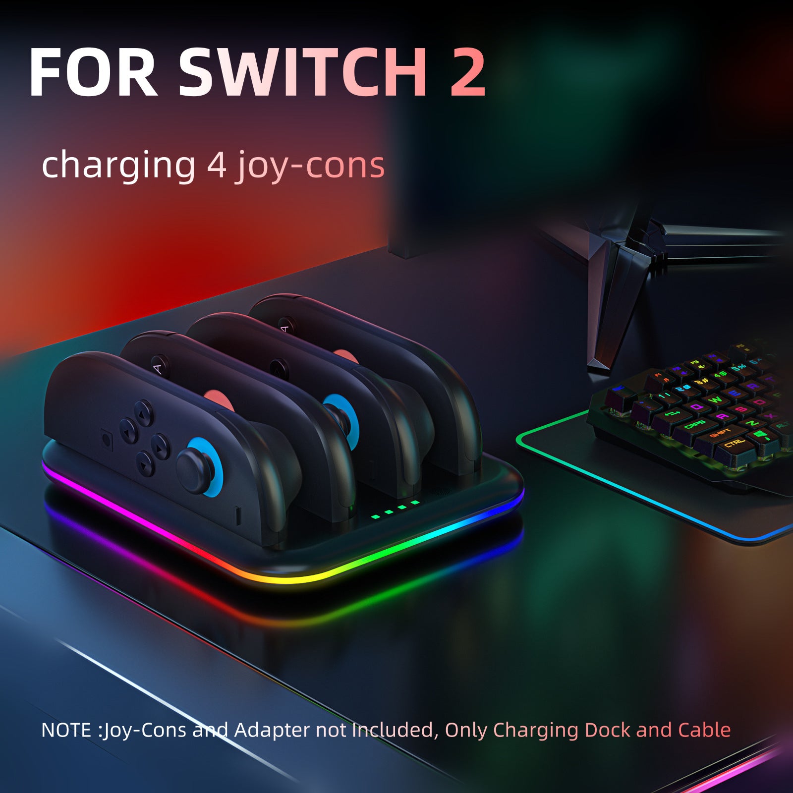 Switch 2 Joy-Con Charging Dock with RGB Lights | 4-Port Fast Charging Station | Horizontal Stand for Nintendo Switch 2 | 4.5" x 1" x 6.5" (11.5x2.5x16.5cm) | ABS Construction
