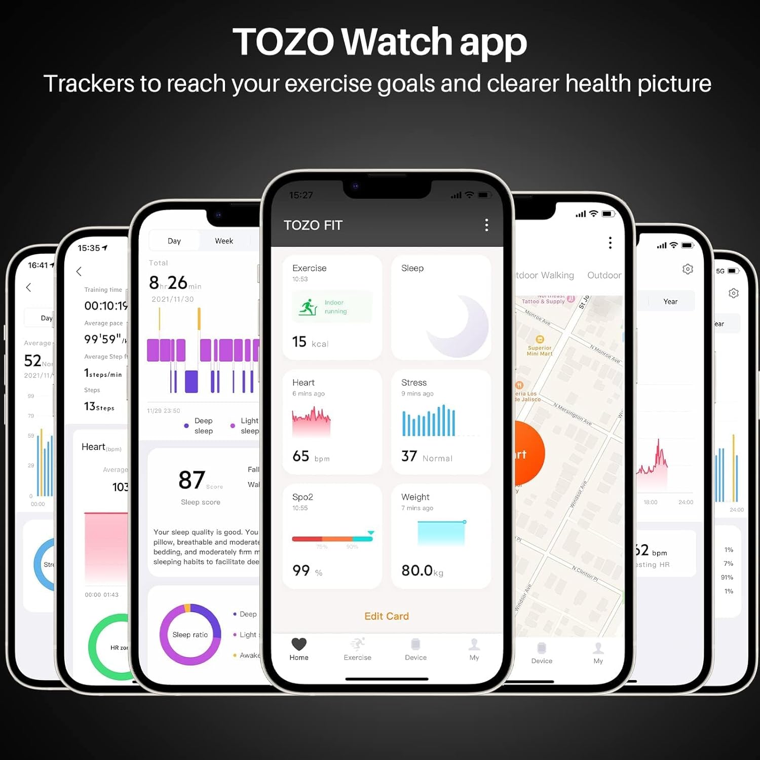 [Heart Rate, Sleep, Blood & Activity Tracking] With our smartwatch, it accurately monitors your heart rate in real time. Also, it provides a detailed analysis of your sleep quality by continuously recording your sleep patterns. During exercise, TOZO smartwatch automatically records daily steps, Distance Counter,calories burned, active minutes, measure your blood oxygen saturation and understand your physical state.